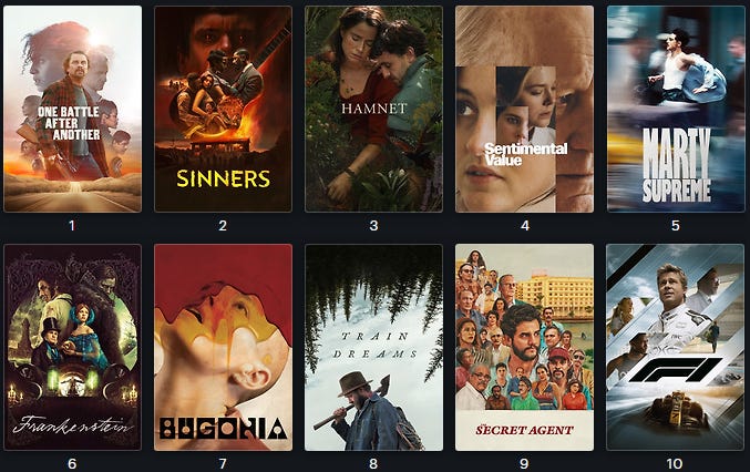 If I Had A Vote: 1. One Battle After Another; 2. Sinners; 3. Frankenstein; 4. F1; 5. Hamnet; 6. Marty Supreme; 7. The Secret Agent; 8. Sentimental Value; 9. Train Dreams; 10. Bugonia
